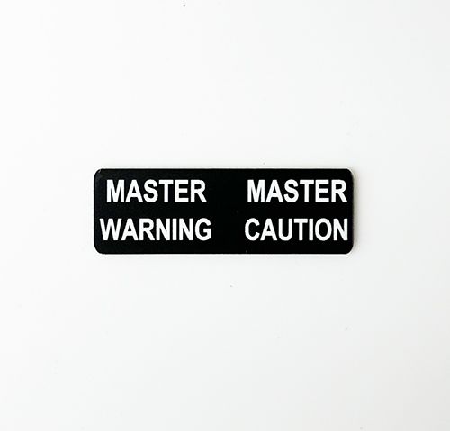 Mark your master aircraft switches and gauges with Comfort House 1.5" x .5" custom labels. On this particular style you may provide special layout instructions. In the label shown in the illustration the instruction was "Please center type so that MASTER is over WARNING and MASTER is over CAUTION with maximum available space between them."