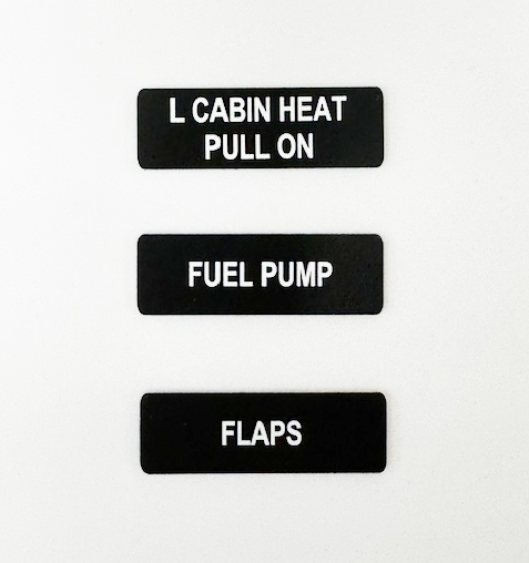 Mark your aircraft switches with custom labels, also known as bezel switch labels. For example: heat, pump, on, off, trim up, starter, elevator, rudder, aileron, or any other text.