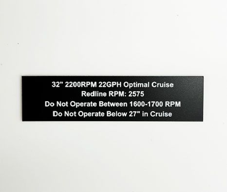 Custom aircraft warning plate label in 2.9"H x .75" size. Also for use in boats, RVs, equipment, panel and other applications. Add up to four lines of your own custom text such as passanger warning, operation limitations, safety regulations, or amateur built.