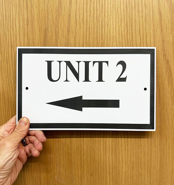 Address Sign or Direction Sign with optional arrow. Display house number, unit, room number, restrooms, security, entrance, exit, or other wayfinding instructions. Made in the USA.