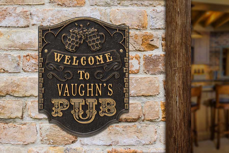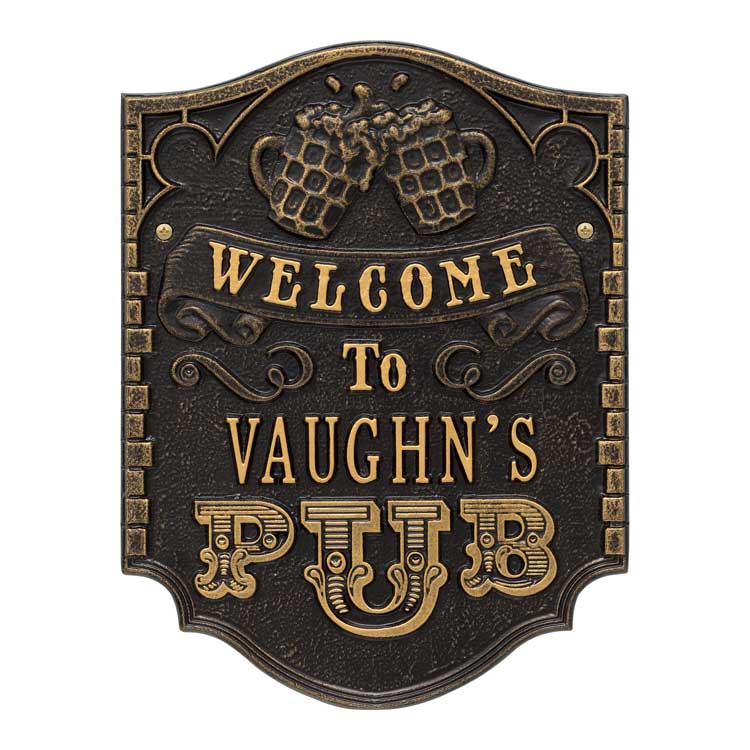 Welcome to My Pub Plaque - - personalized with the pub owner's name. Hang at entrance to your private bar, man cave, tailgate spot, or favorite neighborhood pub. Made in USA.
