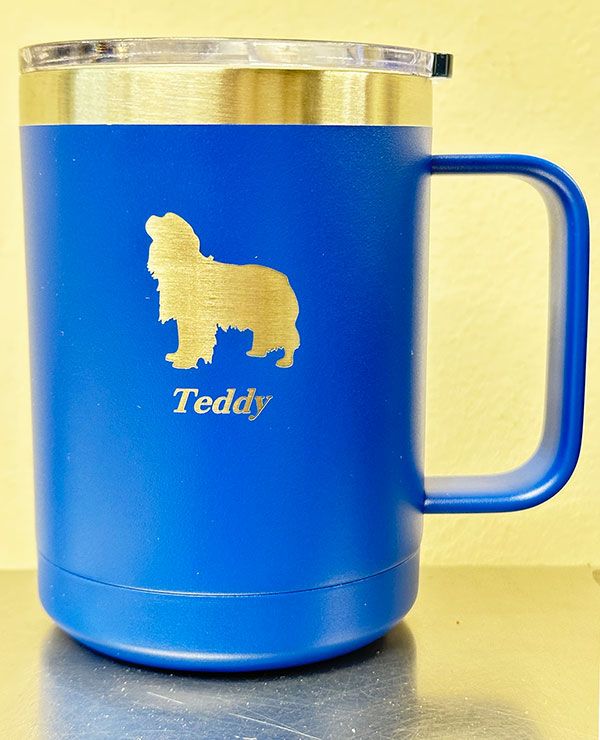 Personalized Dog Theme Coffee Mug - - with Lid. Keeps drinks hot or cold. 15 ounce, double wall vacuum insulated stainless steel mug for all seasons. Perfect for dog owners and dog lovers. Choose from German Shepherd, Lakeland Terrier, Airedale, Chow Chow, Pointer, Irish Setter, Bulldog, Retriever, Corgi, Beagle, Poodle, Labrador, and other breeds shown in our image.