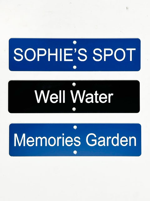 Personalized garden plaque or yard sign displays your own custom message. For example, butterfly garden, do not prune, your hashtag name, heirloom lettuce, Judy's Garden, Dad's man cave, Mom's she shed, path ahead, etc. Can also be used for lot numbers and subdivision names.