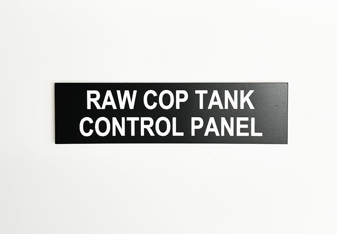 Equipment label plates made with your custom text. For example, Fan Inlet Pressure, Air Supply Pressure Switch, Hopper Level Switch, Water Spray System, Heat Tracing Line 3, 120 Volts, LP-F Circuit 18, Booster Fan Dust Collector, Raw Mill Booster Fan Pressure, Tank Control Pressure.