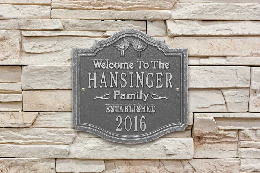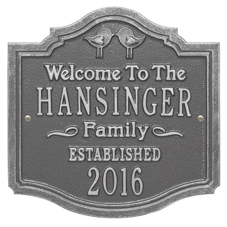 Welcome Sign with Kissing Birds - - personalized Welcome To The Family wall plaque. Includes a pair of kissing birds at the top, the family name, and established year. Made in USA.