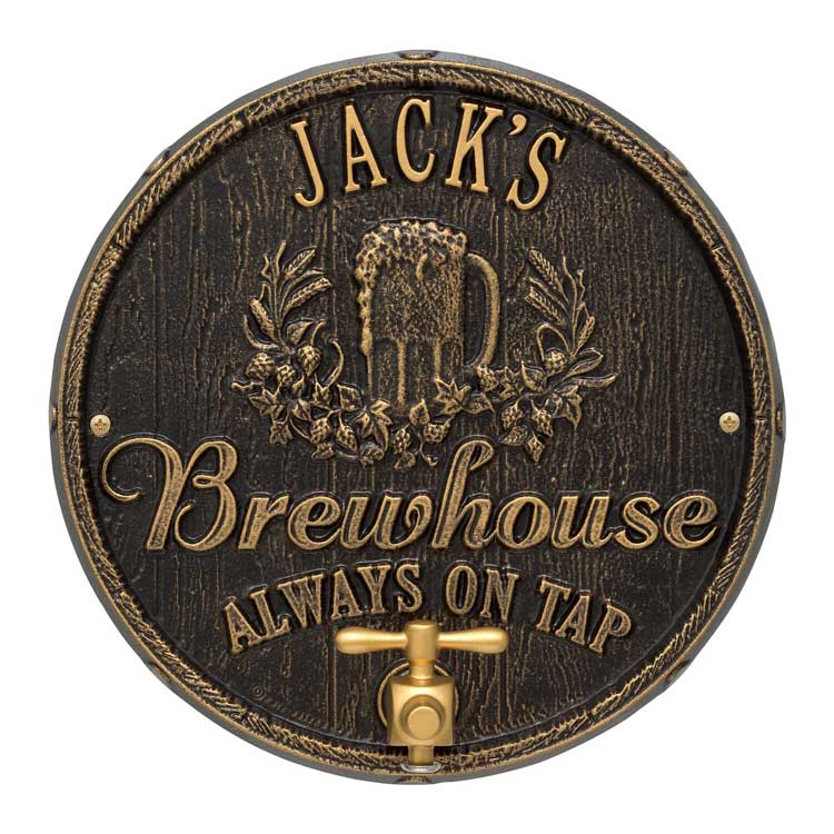 Brewhouse Always On Tap Plaque -- personalized oak barrel shape sign for the home brewer or craft beer aficionado. This custom made lifestyle plaque adds a special touch to your private bar, man cave, brew house, and outdoor party space. Made in USA.