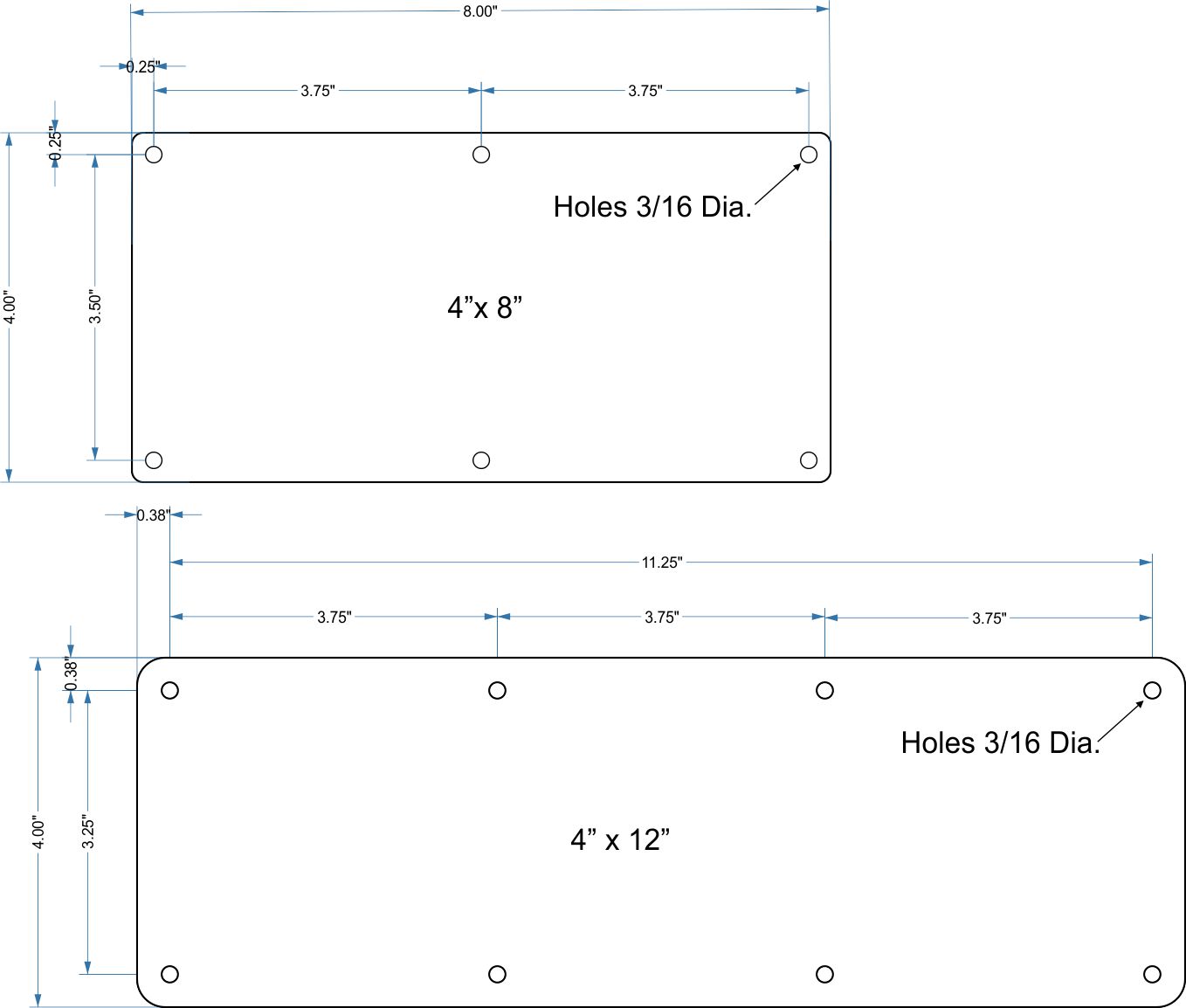 - Panels have either 1/8" or 3/16" diameter mounting holes as shown in part drawings (or choose no mounting holes).